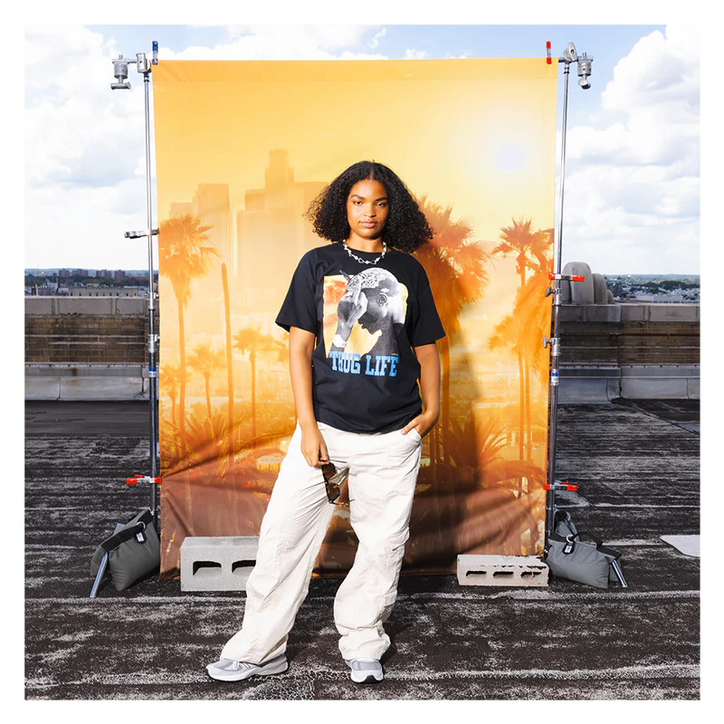 This black T-shirt features a bold graphic printed on the front, showcasing an artistic silhouette with a bandana and a hand gesture as part of the design. The image is framed with vibrant colors and includes the text “THUG LIFE” in a strong, standout font. Made from soft, breathable cotton, the shirt offers comfort for everyday wear. Its unisex fit makes it easy to pair with casual or streetwear outfits.